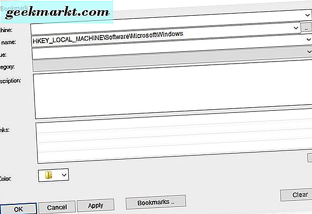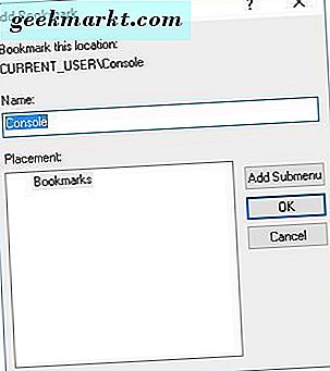 RegimagiK enthält auch die unschätzbare Lesezeichen-Option zum Speichern von Registrierungsschlüsseln für einen schnelleren Zugriff. Wählen Sie eine Taste im Fenster und klicken Sie auf die Schaltfläche Neue Lesezeichen in der Symbolleiste. Dadurch wird ein Fenster geöffnet, in dem Sie einen Titel für das Lesezeichen eingeben und speichern können. Klicken Sie dann in der Menüleiste auf Lesezeichen und wählen Sie den Lesezeichen-Registrierungsschlüssel aus dem Menü.