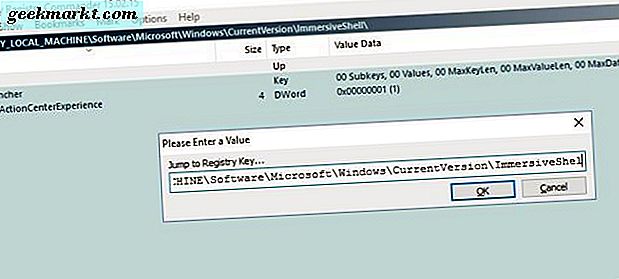 Der fehlende linke Bereich verbessert die Navigation nicht sehr, aber die Option Wechseln zu Schlüssel ist sehr praktisch. Angenommen, Sie stellen die frühere Uhr in Windows 10 wie in diesem Beitrag beschrieben wieder her. Dazu können Sie den Hotkey Strg + G drücken, um das darunter liegende Fenster zu öffnen. Geben Sie dann 'HKEY_LOCAL_MACHINE \ Software \ Microsoft \ Windows \ CurrentVersion \ ImmersiveShell' in dieses Textfeld ein und drücken Sie OK . Dadurch wird der UseActionCenterExperience-Schlüssel geöffnet, den Sie bearbeiten müssen.