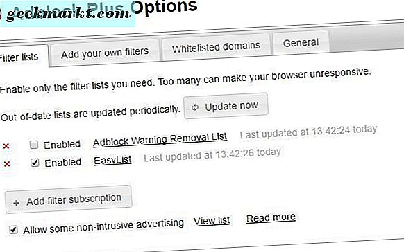 Die Registerkarte AdBlock-Optionen enthält eine Registerkarte Filterlisten, in der Sie Anzeigenfilter einrichten können. Sie können auf dieser Seite benutzerdefinierte Filter zu AdBlock hinzufügen. AdBlock-Benutzer können auch auf der Registerkarte Anpassen Whitelists einrichten, die eine Option Anzeigen auf einer Webseite oder Domäne hinzufügen enthält . Alternativ können Sie die Erweiterung anpassen, um nur Anzeigen auf bestimmten Websites zu blockieren.