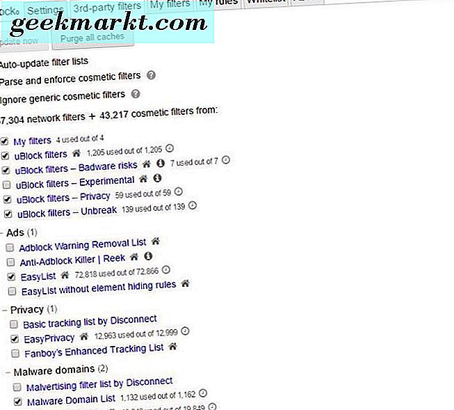 Das Dashboard von uBlock Origin verfügt ebenfalls über zahlreiche Einstellungen. Neben dem Hinzufügen eigener Filter mit dem Elementauswahlmodus können Sie Filter von Drittanbietern aus der unten aufgeführten Filterliste auswählen. Sie können Websites auch zum Tab "Whitelist" im Dashboard hinzufügen, um Anzeigen auf bestimmten Websites zu schalten.