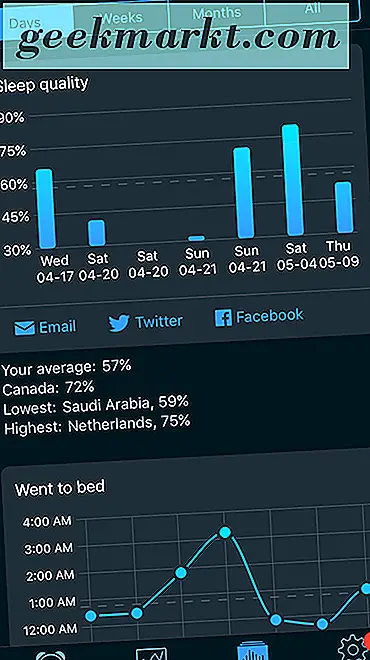 Diese Funktion ist eine großartige Möglichkeit, Ihre Schlafzeiten über einen bestimmten Zeitraum hinweg zu vergleichen und zu sehen, welche Art von Schlafmuster Sie täglich, von Woche zu Woche oder von Monat zu Monat haben. Die App bietet Ihnen auch einen "Schlafqualität" -Prozentsatz, der alle verfügbaren Daten und Statistiken berücksichtigt, um Ihnen eine Prozentzahl zu geben, wie gut Ihr Schlaf war. Je länger der Schlaf und je mehr Zeit im Tiefschlaf verbracht wird, desto höher ist der Prozentsatz. Neben der reinen Prozentangabe gibt Ihnen die App auch die durchschnittliche Schlafqualität in Ihrem Land und zeigt Ihnen auch, welches Land in dieser Kategorie das beste und das schlechteste ist. Die App verfolgt auch Dinge wie die Zeit, schlafend, Zeit, die Sie schlafen gehen, Zeit, Sie aufwachen und mehr (und gibt Ihnen auch die durchschnittliche, beste und schlechteste für diese Kategorien auch).