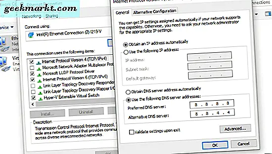 - Wenn 'DNS-Server-Adresse automatisch beziehen' ausgewählt ist, klicken Sie auf die andere Schaltfläche 'Verwende den folgenden DNS ...'. Fügen Sie 8.8.8.8 und 8.8.4.4 als Server hinzu. Klicken Sie auf OK und wiederholen Sie den Test. Wenn Sie DNS-Server angegeben haben, ändern Sie die Einstellung auf Automatisch, klicken Sie auf OK, und wiederholen Sie den Test.