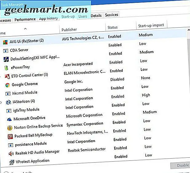 Start-up ist eine weitere neue Registerkarte im Windows 10 Task-Manager enthalten. Dies zeigt Ihnen die gesamte Software, die beim Start geöffnet wird. Klicken Sie dort auf ein Startup-Objekt und drücken Sie die Schaltfläche Deaktivieren, um ein Programm aus dem Start zu entfernen. Wenn Sie einige auf dieser Registerkarte aufgelistete Programme entfernen, wird der Windows 10-Startvorgang beschleunigt.
