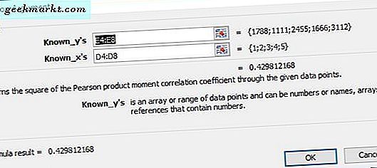 Die Fenster RSQ, SLOPE und INTERCEPT sind fast identisch. Sie enthalten die Felder Known_y und Known_x, die Sie auswählen können, um die y- und x-Variablenwerte zu Ihrer Tabelle hinzuzufügen. Beachten Sie, dass die Zellen nur Zahlen enthalten müssen. Ersetzen Sie daher Monate in der Tabelle durch entsprechende Zahlen wie 1 für Jan, 2 für Feb usw. Klicken Sie dann auf OK, um das Fenster zu schließen und die Funktion der Tabelle hinzuzufügen.