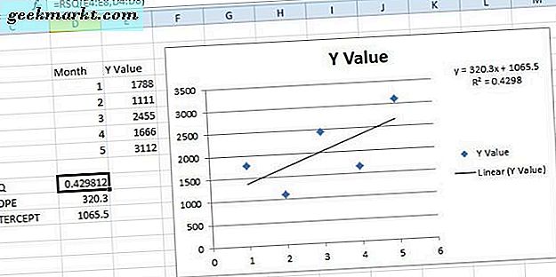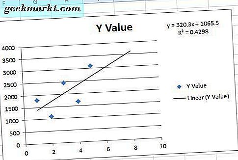 Die lineare Regression modelliert eine Beziehung zwischen abhängigen y und unabhängigen x statistischen Datenvariablen. Mit anderen Worten, sie markieren einen Trend zwischen zwei Tabellenspalten in einer Tabelle. Wenn Sie z. B. eine Excel-Tabelle mit einer Spalte "Monat x" einrichten und eine Datenmenge für jeden der Monate in der benachbarten y-Spalte erfassen, hebt die lineare Regression den Trend zwischen den Variablen x und y durch Hinzufügen von Trendlinien zu Tabellengrafiken hervor . So können Sie Excel-Grafiken eine lineare Regression hinzufügen.