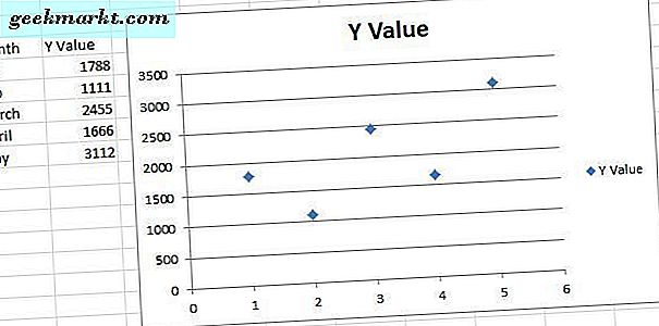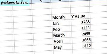 Öffnen Sie zuerst eine leere Excel-Tabelle, wählen Sie die Zelle D3 und geben Sie als Spaltenüberschrift "Monat" ein. Dies ist die x-Variable. Klicken Sie dann auf Zelle E3 und geben Sie Y-Wert als Spaltenüberschrift y ein. Dies ist im Grunde eine Tabelle mit einer aufgezeichneten Reihe von Datenwerten für die Monate Januar-Mai. Geben Sie also die Monate in den Zellen D4 bis D8 und die Datenwerte für sie in den Zellen E4 bis E8 ein, wie in der Momentaufnahme direkt unten gezeigt.