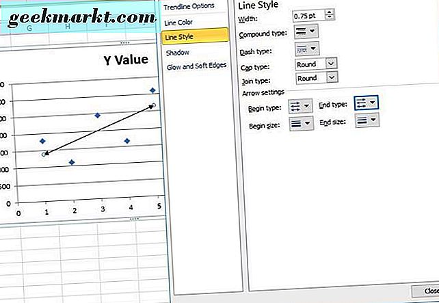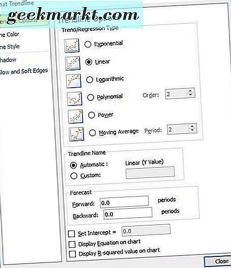 Klicken Sie zuerst auf Trendlinienoptionen und wählen Sie einen Regressionstyp aus. Sie können die Optionen Exponential, Linear, Logarithmisch, Moving Average, Power und Polynomial- Regressionstyp von dort auswählen. Wählen Sie " Linear" und klicken Sie auf " Schließen", um diese Trendlinie dem Diagramm direkt hinzuzufügen.