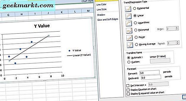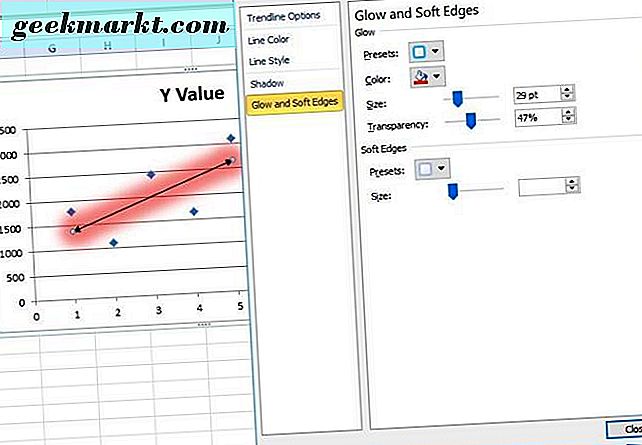 Fügen Sie der Trendlinie einen Glüheffekt hinzu, indem Sie auf Glühen und weiche Kanten klicken. Dadurch öffnet sich die Registerkarte, unter der Sie durch Klicken auf die Schaltfläche " Voreinstellungen" leuchten können. Wählen Sie dann eine Leuchtvariante, um einen Effekt auszuwählen. Klicken Sie auf Farbe, um alternative Farben für den Effekt auszuwählen, und ziehen Sie die Größen- und Transparenzbalken, um das Trendlinienglühen weiter zu konfigurieren.