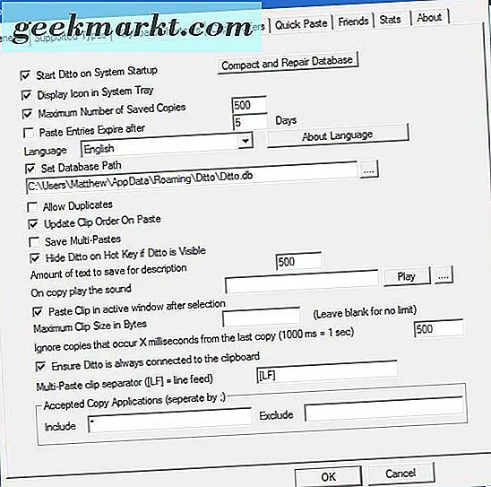 Diese Software speichert standardmäßig bis zu 500 kopierte Objekte. Sie können dies jedoch anpassen, indem Sie mit der rechten Maustaste auf das Taskleistensymbol klicken und Optionen auswählen. Dadurch wird das Fenster direkt darunter geöffnet, das auf der Registerkarte Allgemein das Textfeld Maximale Anzahl gespeicherter Kopien enthält . Geben Sie einen alternativen Wert ein, um einzustellen, wie viele kopierte Objekte gespeichert werden.