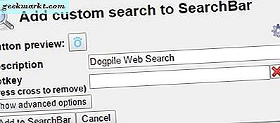 Sie können dort eine Tastenkombination zuweisen, indem Sie sie in das Textfeld Hotkey eingeben. Dann drücke dort die Schaltfläche Add to SearchBar . Jetzt können Sie die neue Suchmaschine in der Suchleiste auswählen.