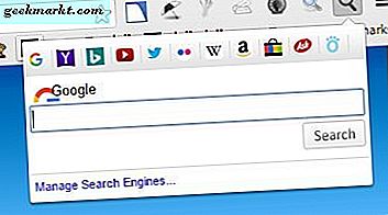 Search Box ist eine alternative Erweiterung mit etwas eingeschränkteren Optionen, die Google Chrome ein separates Suchfeld hinzufügt. Wenn Sie es von hier aus zu Chrome hinzugefügt haben, klicken Sie in der Symbolleiste auf die Schaltfläche Suchen . Das öffnet sein Suchfeld wie im folgenden Schnappschuss.