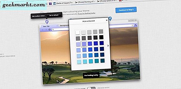 Drücken Sie Weiter zu Schritt 2, um das Farbschema des Themas zu bearbeiten. Dann können Sie die Farben der Registerkartenleiste, der aktiven Registerkarte und der Hintergrundregisterkarten anpassen, indem Sie auf die Pinselsymbole wie in der folgenden Abbildung klicken. Wählen Sie eine Farbe aus der Palette aus, um sie dem Design hinzuzufügen. Alternativ können Sie die Option " Ich bin glücklich" drücken, um schnell ein Farbschema einzurichten, das dem Bild entspricht.