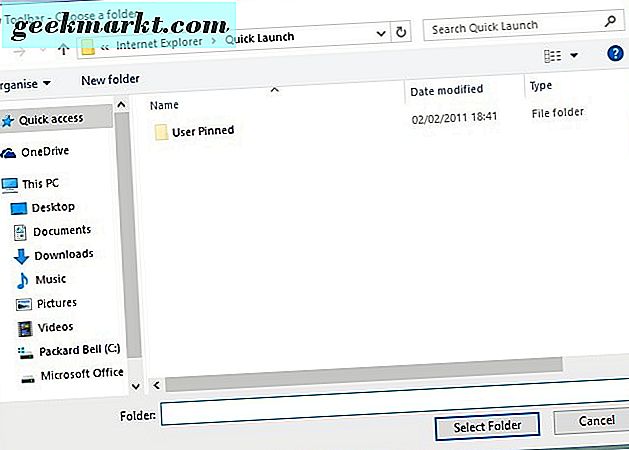 Im Fenster Choose a folder sollten Sie % appdata% \ Microsoft \ Internet Explorer \ Schnellstart in die Adressleiste eingeben und die Eingabetaste drücken. Klicken Sie dann in diesem Fenster auf Ordner auswählen. Jetzt sollten Sie ein Schnellstartmenü auf der rechten Seite Ihrer Taskleiste finden, wie direkt unten gezeigt.