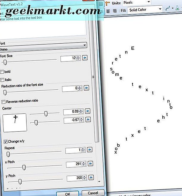 Um eine vertikale Welle hinzuzufügen, klicken Sie auf das Kontrollkästchen x / y ändern . Dann wird der Text vertikal sein und die Seite wie unten gezeigt durchlaufen. Sie können die Textposition mit den Center-Balken genauso anpassen wie im Circle Tool .