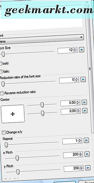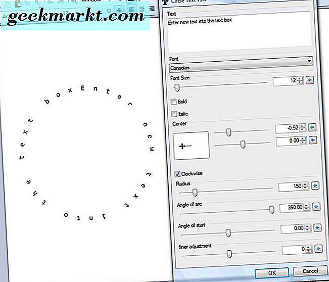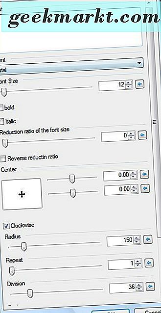 Wählen Sie Kreistext, um das Fenster in der Aufnahme direkt darunter zu öffnen. Wählen Sie eine Schriftart aus dem Dropdown-Menü Schriftart. Geben Sie dann einen Text in das Textfeld ein, und Sie sehen eine Vorschau auf der Blatt-Ebene. Sie können auch einige zusätzliche Fett- und Kursivformatierungsoptionen im Fenster auswählen.
