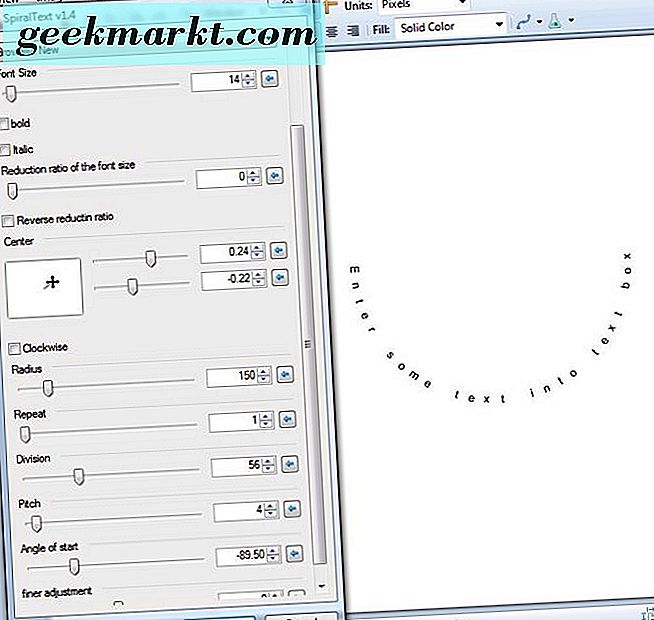 Das SpiralText- Werkzeug fügt einen kreisförmigen Wendeltreppentext-Effekt hinzu. Es fügt also dem Text eine Menge zusätzliche Kurve hinzu. Wählen Sie Spiraltext aus dem Untermenü Textbildung, um das darunter liegende Fenster zu öffnen.