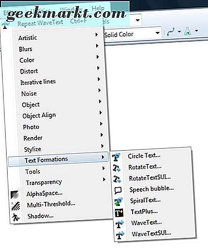Führen Sie nun Paint.NET aus und klicken Sie auf Effekte > Textformatierung, um das Untermenü zu öffnen, das in der Aufnahme direkt darunter angezeigt wird. Dazu gehören acht neue Bearbeitungsoptionen für Text. Am meisten interessieren uns die Werkzeuge Circle Text, SpiralText und WaveText .