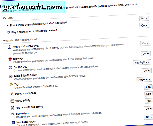 - Gruppenaktivität - Wählen Sie für jede Gruppe separate Benachrichtigungseinstellungen aus. Wählen Sie, ob Sie für alle Posts, Posts von Freunden, nur die Highlights oder gar nichts benachrichtigt werden möchten.