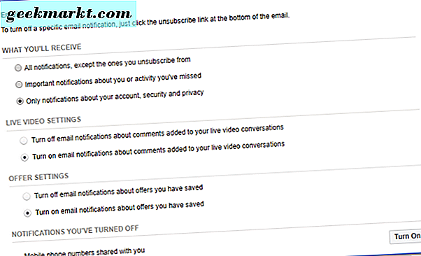 Diese Benachrichtigungen beziehen sich nur auf die E-Mail-Adresse, die mit Ihrem Facebook-Profil verknüpft ist. Wie bei den obigen Facebook-Benachrichtigungen können Sie diese Benachrichtigungen nicht vollständig deaktivieren. Sie können jedoch die Anzahl der Benachrichtigungen, die Sie erhalten, drastisch einschränken.