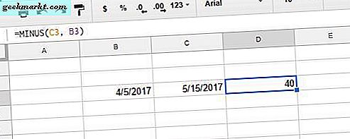 Öffnen Sie zunächst eine leere Google Tabellen-Tabelle in Ihrem Browser. Geben Sie in den Zellen B3 und C3 "04.04.2017" und "15.05.2017" ein. Wählen Sie nun die Zelle D3, die die MINUS-Funktion enthält. Klicken Sie in die FX-Leiste, geben Sie "= MINUS (C3, B3)" ein und drücken Sie die Eingabetaste. Zelle D3 gibt jetzt den Wert 40 zurück, wie direkt unten gezeigt.