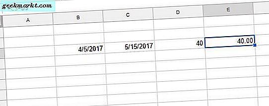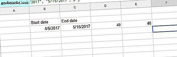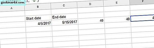 Es ist jedoch nicht unbedingt erforderlich, Tabellenreferenzen in DATEDIF aufzunehmen. Stattdessen können Sie der Funktion Datumsangaben hinzufügen. Klicken Sie auf eine Tabellenkalkulationszelle, um DATEDIF hinzuzufügen, und geben Sie dann '= DATEDIF ("4/5/2017", "5/15/2017", "D") in der FX-Leiste ein. Das gibt auch 40 in der ausgewählten Zelle zurück, wie unten gezeigt.