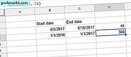 Fügen Sie diese Funktion zu Ihrem Google Tabellen-Tabellendatum für die Termine 01.01.2016 und 01.01.2017 hinzu. Geben Sie "1/1/2016" in Zelle B4 als Startdatum ein und geben Sie dann in C4 als Enddatum für die Funktion "01.01.2017" ein. Wählen Sie nun Zelle D4, geben Sie die Funktion '= DAYS360 (B4, C4)' in die FX-Leiste ein und drücken Sie Enter. Dann enthält Zelle D4 insgesamt 360 Tage zwischen den ausgewählten Daten.