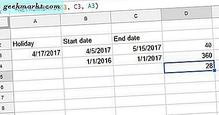 Google Tabellen enthält DAY360, das die Differenz zwischen Daten für ein 360-Tage-Jahr berechnet. Der 360-Tage-Kalender ist hauptsächlich für Finanztabellen gedacht, bei denen Zinsberechnungen erforderlich sein können. Die Syntax für DAYS360 lautet: = DAYS360 (start_date, end_date, [method]) . Die [Methode] ist ein optionaler Indikator, den Sie für die Tageszählmethode verwenden können.