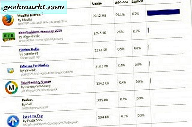 Diese Seite zeigt Ihnen eine Liste Ihrer laufenden Firefox-Add-Ons mit ihrer RAM-Auslastung, die in der Spalte "Usage" angegeben ist. Diejenigen, die am meisten RAM haben, werden oben auf der Seite aufgelistet. Beachten Sie, dass dies keine statischen oder dynamischen Overlays enthält, die Skripts hinzufügen, die die RAM-Auslastung der Erweiterungen erhöhen können. Daher kann die RAM-Nutzung des Add-Ons höher sein als auf dieser Registerkarte angegeben.