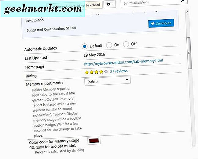 Klicken Sie zum Auswählen alternativer RAM-Berichtsmodi oben rechts auf die Schaltfläche Menü öffnen, Add-ons, Erweiterungen, und drücken Sie Optionen neben Registerkarte Speichernutzung. Dadurch werden die unten gezeigten Optionen geöffnet. Wenn Sie ein wenig nach unten blättern, können Sie das Dropdown-Menü Speicherberichtmodus auswählen.