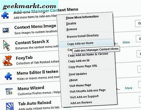 Klicken Sie nun mit der rechten Maustaste auf ein Add-On, das dort aufgelistet ist, um das Kontextmenü zu öffnen. Es enthält eine Reihe von zusätzlichen Optionen zur Auswahl. In diesen Menüs gibt es fünf neue Optionen, mit denen der Name, die ID, die Version und die Homepage-URL des Add-ons kopiert werden können.