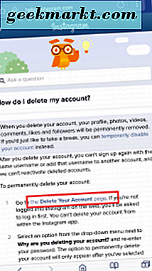 Beginnen Sie, indem Sie auf den Tab "Profil" klicken. Es ist am weitesten rechts auf der Navigationsleiste am unteren Bildschirmrand. Leider bietet Instagram keine Möglichkeit, Ihr Konto in der App selbst zu löschen. Daher müssen wir den Webbrowser Ihres Telefons verwenden, um dies zu ermöglichen. Scrollen Sie zum Ende der Seite, bis Sie eine Option für die "Instagram-Hilfe" sehen. Wenn Sie darauf klicken, gelangen Sie in Ihren bevorzugten Webbrowser. Ich verwende den Samsung-Browser, aber ich vermute, dass die meisten von Ihnen Chrome verwenden. Es gibt viele Informationen auf dieser Seite, aber lass dich nicht stressen. Scrollen Sie zum Ende der Seite, bis Sie unter "Themen durchsuchen" die Option "Ihr Konto verwalten" finden. Sie sind bereits fast fertig, also machen Sie weiter.