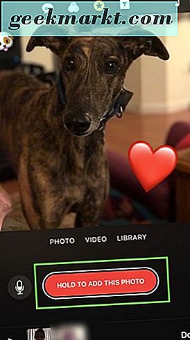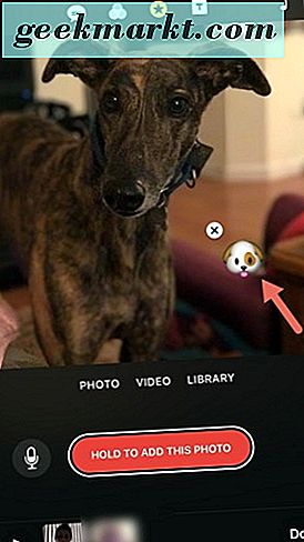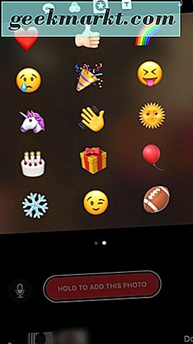 - Sie können Ihrem Clip beliebig viele Emoji hinzufügen. Sobald Sie mit Ihrer Emoji-Auswahl zufrieden sind, halten Sie den roten Knopf gedrückt, der "Halten" zeigt, um ein Foto auf dem iPhone-Bildschirm in der Clip-App hinzuzufügen.