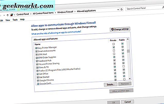 Überprüfen Sie außerdem, ob die Windows-Firewalleinstellungen Remote Desktop nicht blockieren. Öffnen Sie die Einstellungen, indem Sie in das Suchfeld von Cortana oder Windows 7 "firewall" eingeben. Wählen Sie die Windows-Firewall aus und klicken Sie auf Eine App zulassen, um das unten angezeigte Fenster zu öffnen.