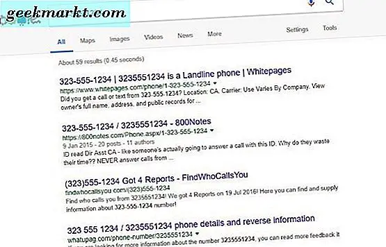 Wir können die größte Suchmaschine der Welt benutzen, um nach uns zu suchen, und sie kann oft nützliche Informationen zurückgeben. Sie haben zwei Hauptoptionen, Sie können die Telefonnummer eingeben und eine Suche durchführen und sehen, was auftaucht. Sie können auch nach "Reverse Phone Lookup" suchen, eine bestimmte Website finden und es auf diese Weise tun.