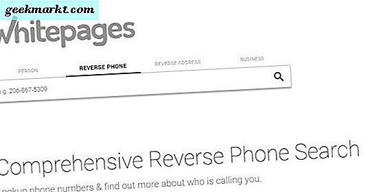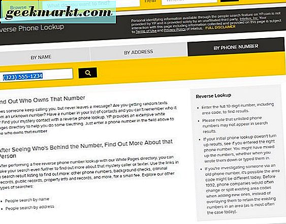 WhitePages.com ist wahrscheinlich der größte Datenanbieter im Internet. Sicherlich für US-Daten sowieso. Einer der kostenlosen Dienste ist ein Reverse-Lookup. Navigieren Sie zu der Seite, wählen Sie Reverse Phone Lookup von der Mitte aus, fügen Sie die Nummer ein und drücken Sie Search.