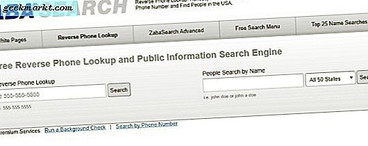 Zabasearch ist ein weiterer riesiger Datenspeicher, den es zu überdenken gilt. Es enthält seine eigenen weißen Seiten, viele Suchkriterien und eine umfassende Reverse-Lookup-Funktion. Fügen Sie die Telefonnummer dem Suchfeld in der Mitte hinzu und wählen Sie Suchen.
