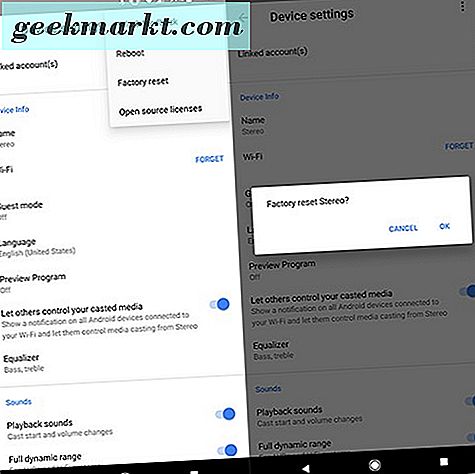 Schließlich möchten Sie möglicherweise versuchen, das Gerät auf die Werkseinstellungen zurückzusetzen. Wir haben hier einen ausführlichen Artikel zu allen Methoden, einschließlich der Vorgehensweise, das Gerät auf die Werkseinstellungen zurückzusetzen, ohne dass es mit Ihrem Heimnetzwerk verbunden ist. Die Hauptmethode zum Zurücksetzen des Geräts verwendet jedoch die bereits besprochene Google Home App. Tippen Sie auf das Gerätesymbol in der App und wählen Sie das Chromecast-Gerät in Ihrer App aus, um Ihr Gerät über die App auf Ihrem Telefon zurückzusetzen. Nachdem Sie das Einstellungsmenü Ihres Geräts ausgewählt haben, klicken Sie auf das dreifach gepunktete Symbol in den Einstellungen, um die Option zum Zurücksetzen auf die Werkseinstellungen auszuwählen. Google Home fordert Sie auf, sicherzustellen, dass Sie Ihr Gerät zurücksetzen möchten. Sobald Sie Ihre Auswahl bestätigt haben, können Sie Ihr Gerät mit den Einstellungen zurücksetzen, um das Audio erneut zu testen.