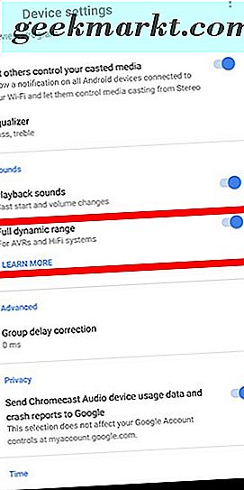 Zuerst müssen wir zurück in das Einstellungsmenü Ihres Geräts in Google Home gehen. Öffnen Sie Ihre Chromecast Audio-Einstellungen wie in unserem vorherigen Abschnitt beschrieben und finden Sie den Abschnitt Sounds. Im Gegensatz zu einem herkömmlichen Chromecast-Gerät bietet Chromecast Audio hier eine neue Einstellung, die noch nie zuvor gesehen wurde: voller Dynamikbereich. Wenn Sie sich nicht sicher sind, ob Sie diese Einstellung aktivieren möchten oder nicht, sollten Sie sie deaktivieren. Der volle Dynamikbereich ist für Premium-Audio-Hardware wie HiFi-Audiosysteme und AV-Receiver ausgelegt. Wenn Sie versuchen, Sound durch ein Paar Computerlautsprecher von Amazon zu pumpen, kann diese Einstellung Verzerrungen und unangemessene Lautstärkerhöhungen auf Ihrem Gerät verursachen. Daher sollten Sie diese Funktion deaktivieren. Wenn Sie Schwierigkeiten haben, Ihre Musik zu hören, stellen Sie sicher, dass diese Einstellung deaktiviert ist.