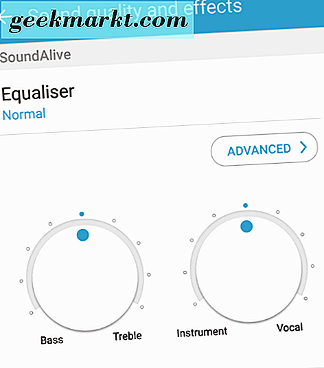 Nicht jedes Telefon verfügt über einen integrierten Equalizer, was bedeutet, dass Sie in den Play Store schauen müssen. Einige Geräte, wie Samsung Galaxy S7 und Galaxy S8, einschließlich der standardmäßigen Equalizer, sind im Einstellungsmenü des Telefons verfügbar, indem Sie in die Einstellungen der App eintauchen. Andere Telefone, einschließlich der Google Pixel-Serie, verwenden einen von Google entwickelten Equalizer, der insgesamt ziemlich einfach ist. Wenn Sie sehen möchten, ob Ihr Android-Telefon über einen vorinstallierten Equalizer verfügt, der in der App enthalten ist, tauchen Sie in Google Play Music ein, das standardmäßig auf jedem modernen Android-Telefon enthalten ist. Im Einstellungsmenü finden Sie unter den Wiedergabeeinstellungen die Option "Equalizer". Wenn die Menüauswahl nicht vorhanden oder ausgegraut ist, ist möglicherweise kein anwendbarer Equalizer in der Systemsoftware Ihres Telefons enthalten. Andernfalls klicken Sie auf die Einstellung. Dadurch wird Ihr System-EQ geladen, der Ihnen eine Reihe von Optionen bietet. Samsungs EQ (siehe oben) bietet Regler für Bass und Treble sowie Instrument und Vocal sowie eine Preset-Option zur Auswahl verschiedener Klangvariationen. Ein traditionellerer Equalizer mit Frequenzschiebern ist über die Registerkarte Erweitert verfügbar.