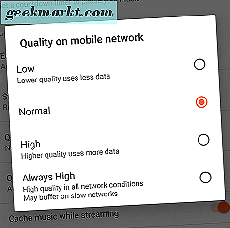 - Google Play Music: Als Standard-Musik-App für Android ist es wahrscheinlicher, dass Nutzer von Play Music den Dienst abonnieren als ein iOS-Nutzer. Hier sind die guten Nachrichten: Wie Google Spotify hat Google Play Music eine Umschaltfunktion für die Qualitätsstufen von Musik sowohl für das Streaming als auch für heruntergeladene Musiktitel. Wenn Sie die Option "Hoch" oder "Immer hoch" wählen, klingt die Qualität besser als "Normal" oder "Niedrig". Gleichzeitig zeigt die App jedoch sehr schlecht, was Sie von der Qualitätsstufe erwarten können. Im Allgemeinen klang die hohe Einstellung ähnlich der Extreme-Option auf Spotify (320kbit / s), und Sie können davon ausgehen, dass die Bitrate identisch ist, wenn nicht sogar ähnlich.