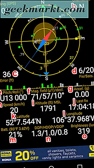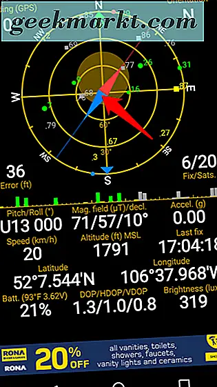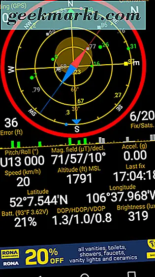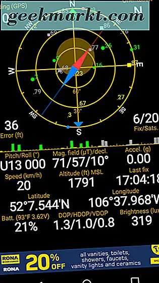 Je mehr Satelliten auf Ihrem Gerät gespeichert sind, desto höher ist die Genauigkeit der angezeigten Daten. Zum Zeitpunkt der Erstellung dieses Screenshots war mein Gerät an 6 Satelliten angeschlossen. Der Entwickler gibt auf seiner Website an, dass normalerweise 4 Satelliten für ein GPS-Schloss benötigt werden.