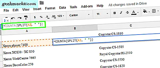 Um jedes Wort in einer Zelle zu zählen, haben wir eine spezielle Google Sheets-Formel verwendet: " = COUNTA (SPLIT (A2, " ")) . Wie im obigen Screenshot zu sehen ist, liefert die Verwendung dieser Formel automatisch eine Zählung der Wörter in einer bestimmten Zelle. COUNT zählt automatisch die Wörter in der Zelle, SPLIT zählt alles, getrennt durch ein Leerzeichen, als einen einzelnen Datenpunkt (so dass Ihr Inhalt z. B. gezählt werden kann, wenn es sich nur um eine Zahl handelt) und den letzten Abschnitt ( hier als A2 gesehen) zählt die Zelle, die Sie betrachten möchten. Wie in Google Tabellen üblich, können Sie in jeder Zelle leicht Ihre Daten mithilfe eines gitterbasierten Standortformats verfolgen (dh A2 findet die zweite Zelle in der Spalte A). Stellen Sie daher sicher, dass Sie wissen, welche Zelle Sie betrachten . So verwenden Sie diese Formel: