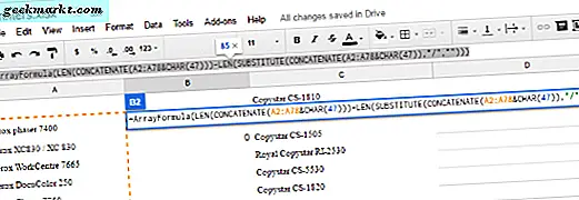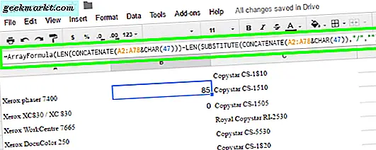 Sheets ist nicht vollständig ohne die Fähigkeit, Wörter innerhalb des Dokuments zu zählen. Zwar gibt es kein offizielles Wortzählungstool, wie Sie es in Google Docs finden, aber in Google Tabellen wird eine Textzählung in bestimmten Spalten, Zeilen und Zellen angezeigt. Um eine Vorschau zu sehen, klicken Sie auf eine Zelle, ob sie eine Formel oder nur eine Beschriftung enthält. In der Vorschau-Box oben auf der Seite sehen Sie, was jede Zelle geschrieben hat, wodurch der Inhalt auf der Seite leicht geändert werden kann. In unserem Vorschaubild unten haben wir eine Tabelle mit einer Liste von Druckern. Dieses Dokument enthält 78 Zeilen, die eine Mischung aus Wörtern und Modellnummern enthalten. Bei jeder Modellnummer werden diese in Google Tabellen nicht als Wörter gezählt, sondern nur "Xerox", "Copystar" usw.