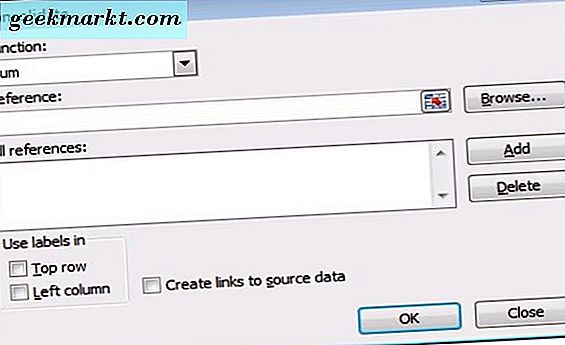 Öffnen Sie zunächst eine leere Tabelle, andernfalls das Master-Arbeitsblatt, das die verbundenen Zellbereiche enthält. Klicken Sie auf die Registerkarte Daten, auf der Sie eine Konsolidierungsoption auswählen können. Dadurch wird das Dialogfeld "Konsolidieren" geöffnet, das ein Dropdown-Menü "Funktion" enthält. Wählen Sie Summe aus dem Dropdown-Menü.