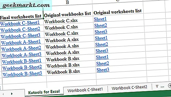 Kutools ist ein Excel-Add-On, das eine Fülle von Tools enthält. Combine ist ein Werkzeug in Kutools, mit dem Sie mehrere Blätter aus alternativen Excel-Dateien in eine Tabelle zusammenführen können. Dadurch können Sie eine Tabelle erstellen, die Verknüpfungen zu allen kombinierten Arbeitsblättern enthält, wie im folgenden Screenshot. Diese Kutools for Excel-Seite enthält weitere Add-On-Details.