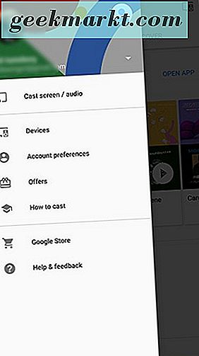 Okay, jetzt, wo wir die Google Home App heruntergeladen und unser Chromecast-Setup installiert haben, können wir unser Android-Gerät auf einen Fernseher oder Monitor spiegeln. Gehe in die Google Home App, wenn du es noch nicht getan hast, tippe oben rechts auf die dreizeilige Menüschaltfläche und tippe in der oberen Menüauswahl auf "Bildschirm / Audio scannen".