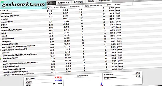 Um den Aktivitätsmonitor zu starten, wählen Sie Programme, Dienstprogramme und Aktivitätsmonitor. Es wird ein großes Fenster angezeigt, das die CPU-Auslastung mit einer Scroll-Anzeige der Apps zeigt, wobei Prozentsätze der CPU-Uhrzeit in absteigender Reihenfolge verwendet werden. Die App oder der Prozess, der oben aufgeführt wird, verwendet derzeit die meiste CPU. Klicken Sie auf den% CPU-Menükopf, um die Reihenfolge zu ändern.