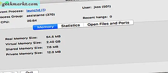 Wenn Sie wie bei der CPU auf einen Prozess doppelklicken, wird ein weiteres detailliertes Fenster geöffnet, in dem jeder Aspekt dieses Prozesses hervorgehoben wird. Dazu gehört, wie viel realer und virtueller Speicher verwendet wird. Die Optionen Quit und Force Quit sind auch hier verfügbar.