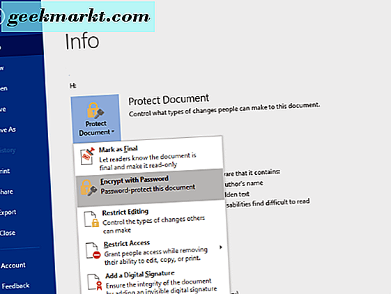 Beispielsweise können Sie die meisten Microsoft Office-Dokumente einzeln mit einem Kennwort schützen. Öffnen Sie das Dokument, wählen Sie Datei, Info und Dokument schützen aus den Menüoptionen. Wählen Sie die Option zum Verschlüsseln mit Passwort. Fügen Sie das Passwort hinzu und speichern Sie es ab. Ab diesem Zeitpunkt werden Sie bei jedem Versuch, das Dokument zu öffnen, zur Eingabe dieses Kennworts aufgefordert.