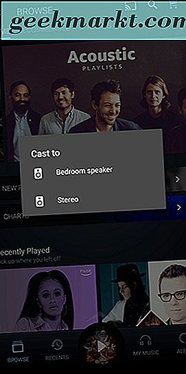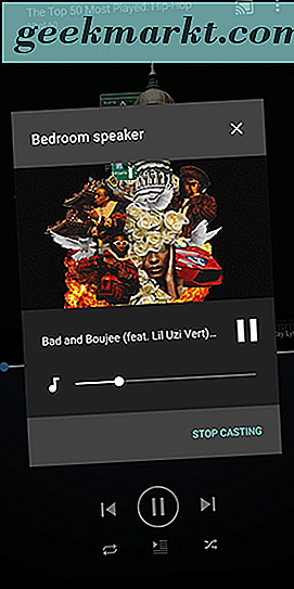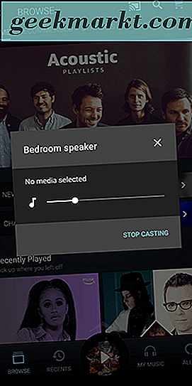 Tippen Sie auf das Cast-Symbol, um eine Liste der unterstützten Geräte in Ihrem Netzwerk anzuzeigen, einschließlich Ihres Google Home-, Home Mini- oder Home Max-Lautsprechers. Wählen Sie den Sprecher aus, zu dem Sie wechseln möchten, und Sie hören ein Klingeln vom Gerät, nachdem Sie eine Verbindung hergestellt haben. Sobald Sie mit der Wiedergabe von Musik aus der Android-Anwendung beginnen, wird die Wiedergabe automatisch auf dem Google Home-Lautsprecher in Ihrem Haus gestartet. Wenn Sie vor der Wiedergabe nicht sicher sind, ob Sie mit Ihrem Gerät verbunden sind, überprüfen Sie das Cast-Symbol in der Anwendung. Wenn Sie verbunden sind, wird eine weiße Farbe angezeigt. Wenn Sie eine Weile keine Musik abgespielt haben, wird Ihr Telefon oder Tablet möglicherweise von Ihrem Lautsprecher getrennt.